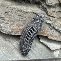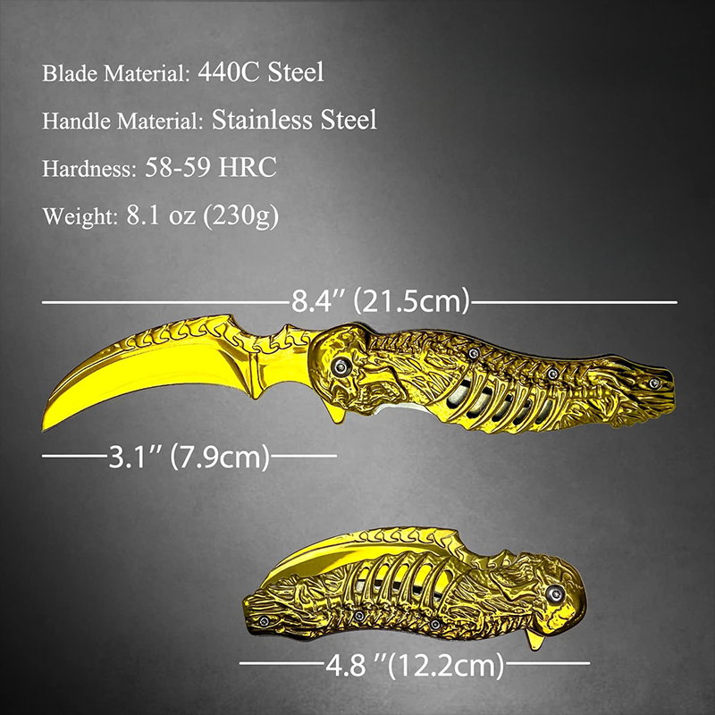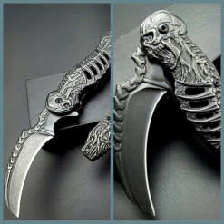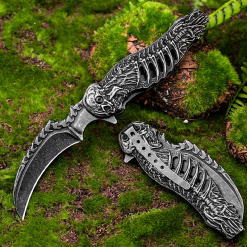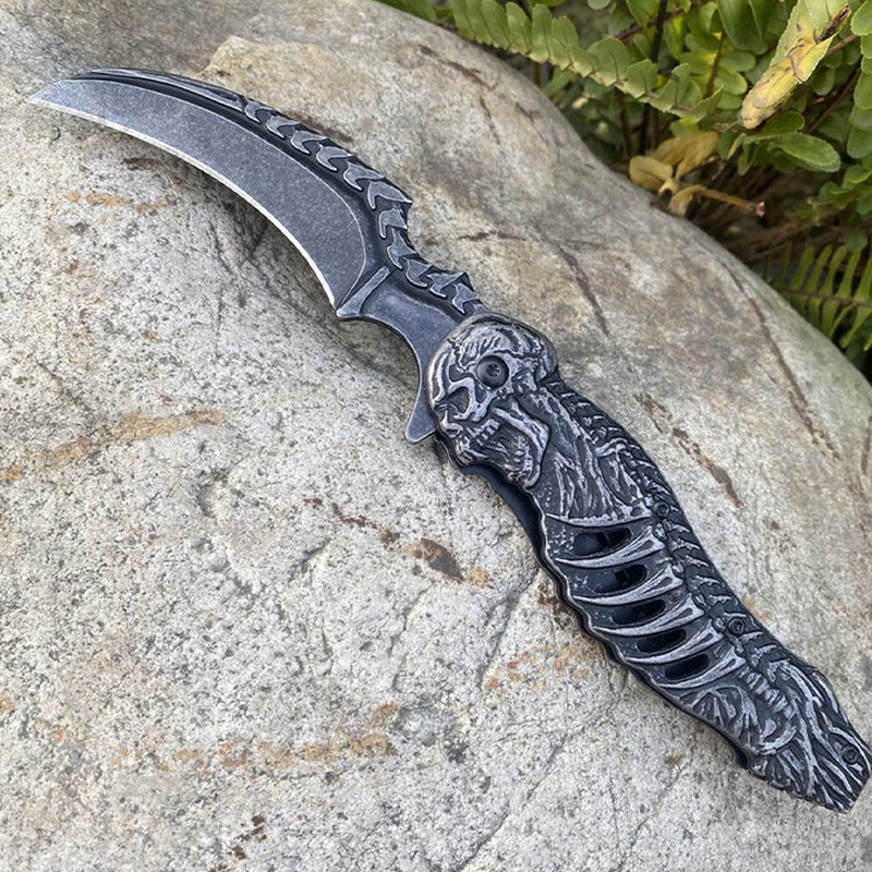 Ürünün namlu kısmında kullanılan yüksek karbonlu 440C paslanmaz çelik, korozyona karşı dirençli yapısı ve uzun süre keskinliğini koruma özelliği ile bilinir. Karambitlerin karakteristik özelliği olan kavisli yapı, kesme ve dilimleme işlemlerinde maksimum performans sunar. Kabza üzerindeki iskelet işlemeleri, tutuş ergonomisini destekleyerek elden kaymayı önler.