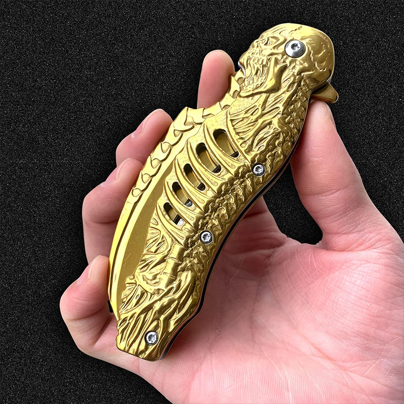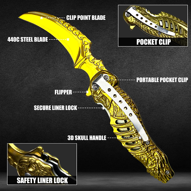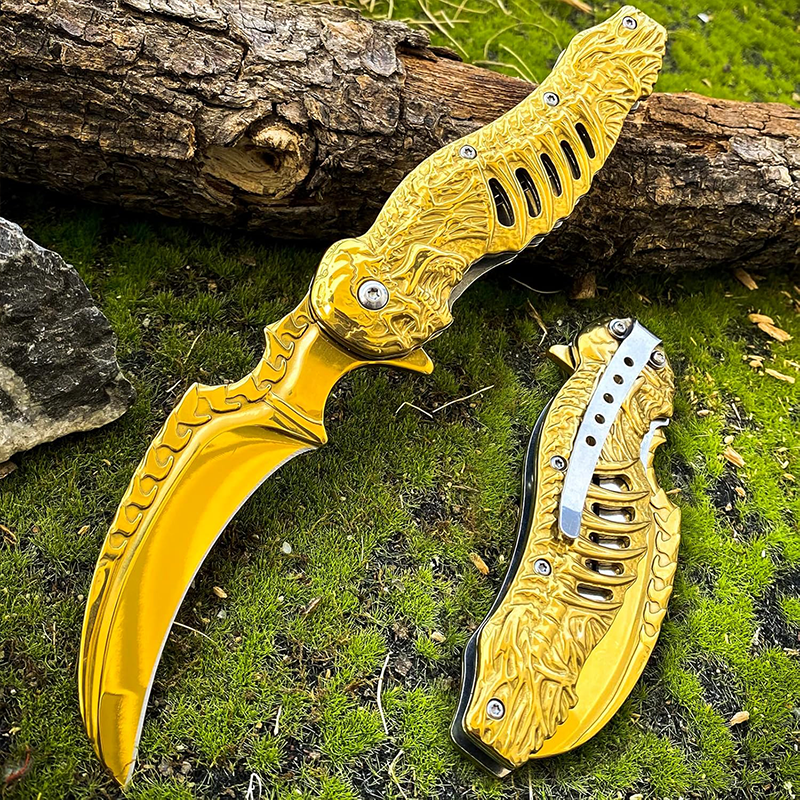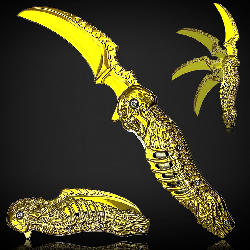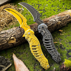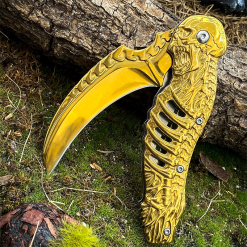 Browning Gold İskelet Tasarımlı Karambit Çakı, hem estetik tasarımı hem de üstün malzeme kalitesiyle outdoor dünyasında fark yaratıyor. Altın sarısı (Gold) rengi ve kabzasındaki özel kurukafa iskelet figürleri, bu bıçağı sadece bir araç değil, aynı zamanda etkileyici bir koleksiyon parçası haline getiriyor.
