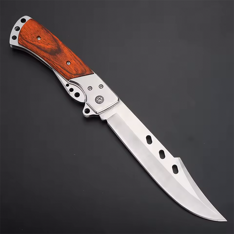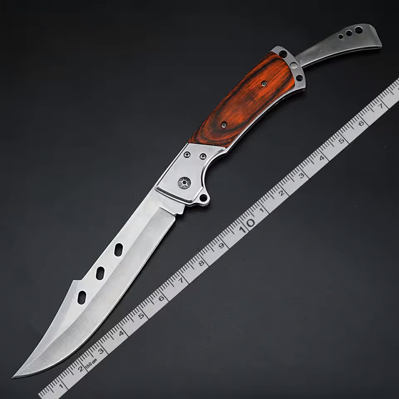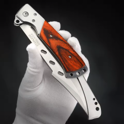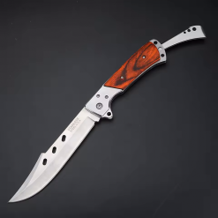 - [ERGONOMİK SAP] – Uzun bıçaklı katlanır bıçak, rahat ve sağlam bir tutuş sağlayan üstün kaliteli gül ağacı sapıyla tasarlanmıştır. Sapın ucunda, bıçağı saklamak için katlamayı sağlayan bir uzatma parçası bulunur.